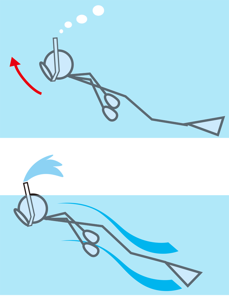 - スノーケルを咥えたままの口で大きく息を吸い、水面上に出たスノーケルの先から酸素を肺いっぱいに取り込みます。